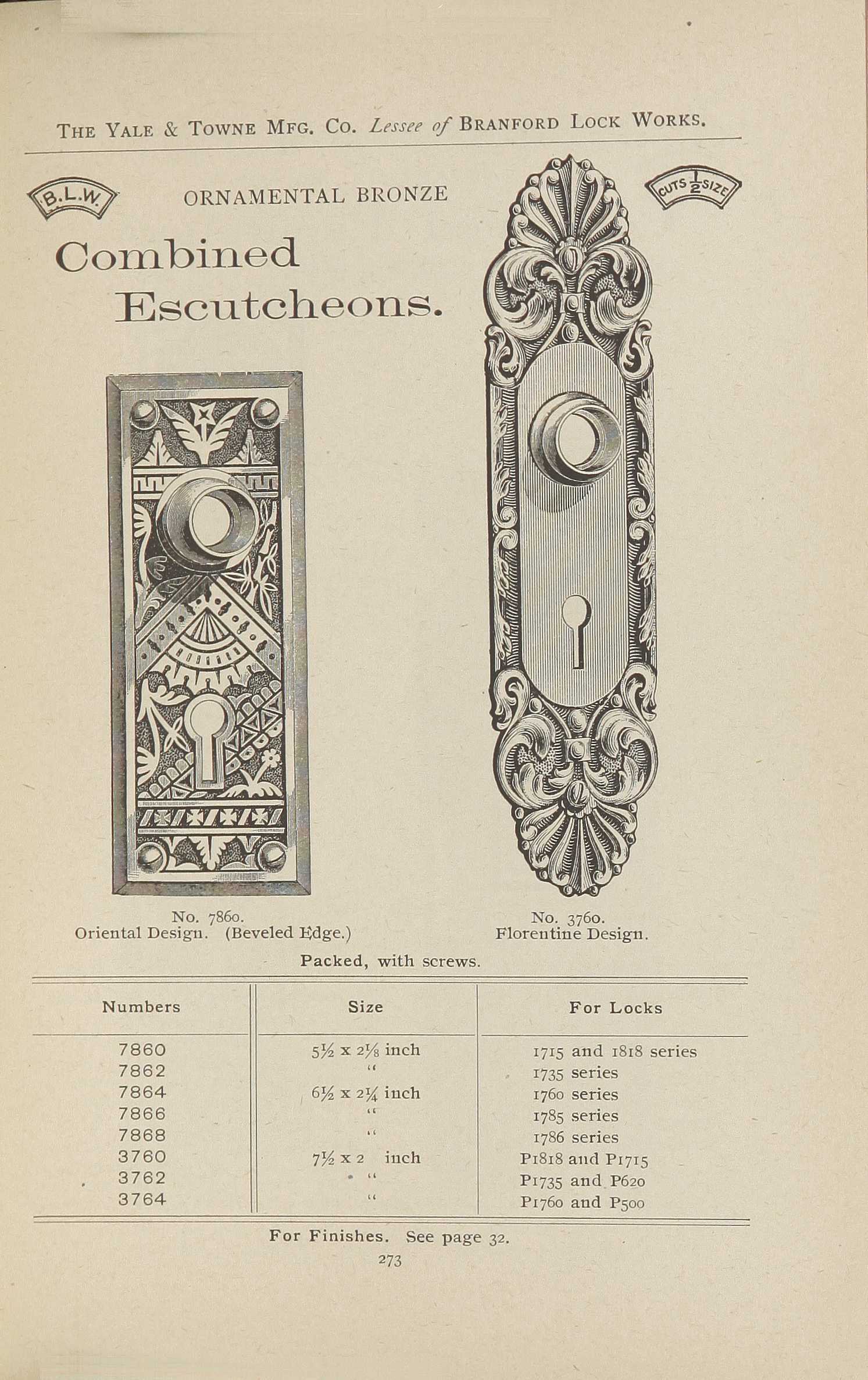 This is a cast bronze door escutcheon plate in an Italian Renaissance design called "Florentine" made by the Branford Lock Works and shown in their 1893 catalog.Â