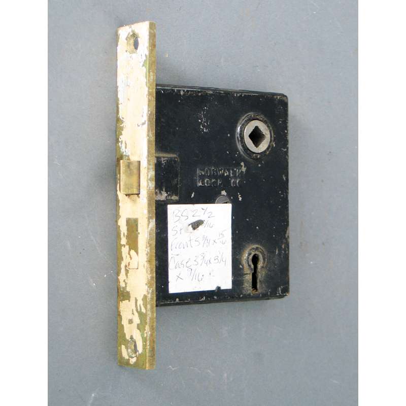 Interior cast iron and solid brass Norwalk mortise door lock. An interior mortise lock is This is a lock which is used on an interior door that has been cut with a pocket or hole (called a mortise) into which the lock is to be fitted. Interior mortise locks commonly include a doorknob hub, through which a doorknob spindle is installed and doorknobs are mounted on each side and secured into place with pins or set screws; and a keyhole which accommodates an old-fashioned bit or skeleton key which in turn throws the deadbolt to lock and unlock the door. Mortise locks have specific dimensions including backset, the measurement from the edge of the faceplate (the strip that shows when the mortise lock is installed in the door) to the center of the doorknob hub; and spacing, the measurement from the center of the doorknob hub to the center of the round part of the keyhole. The dimensions were not standardized in the 19th century so it is important to note the dimensions of your door prior to purchasing a mortise lock.