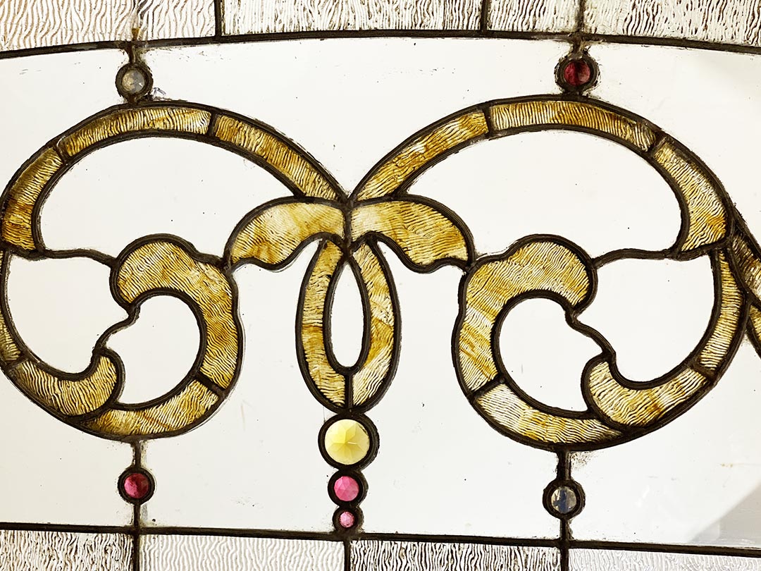 This is an arched top stained glass transom window circa 1880, removed from a Syracuse, NY city house that was demolished. This was installed over a set of double doors. Please review the condition tab for details of cracks.