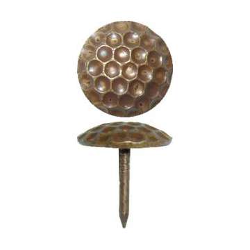 Bag of 12 hammered head decorative steel nails, these can be used on furniture or upholstery, or use them as tacks on a bulletin board. See dimensions tab for complete item dimensions. Old gold finish.