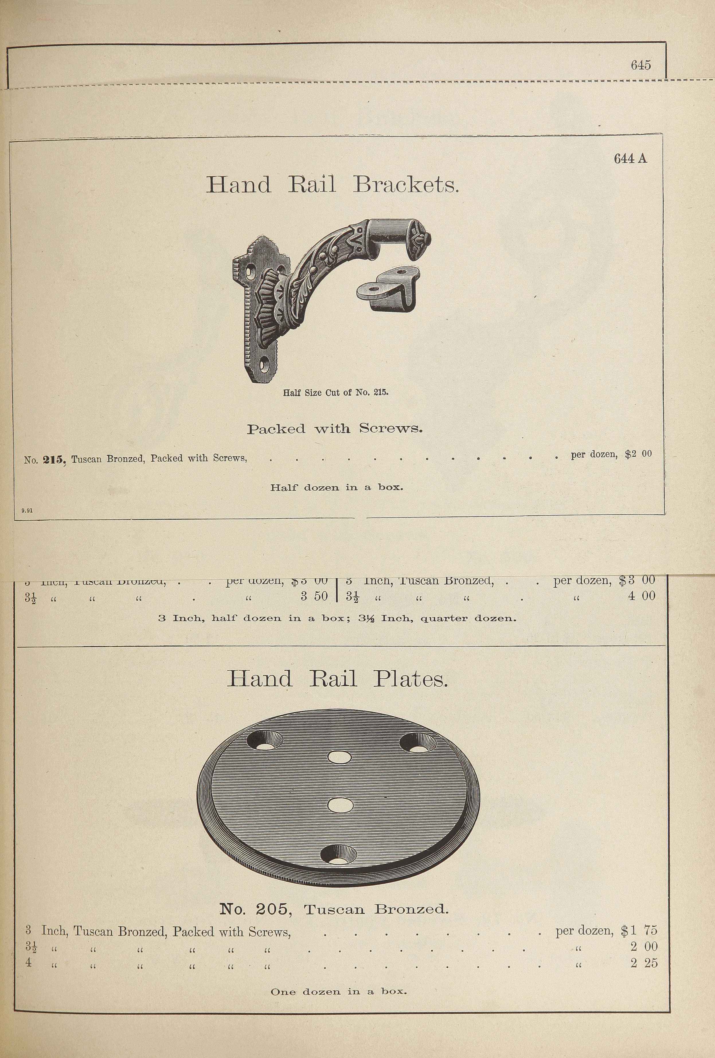 This is a set of three antique Gothic Revival handrail brackets made by Sargent & Co. and shown in their 1888 catalog. These very large handrail brackets measure 5" projection from wall and the backplates are 3-3/8" high x 1-7/8" wide.Â
