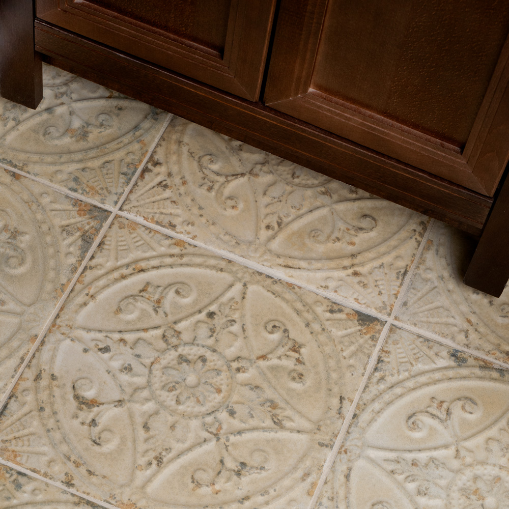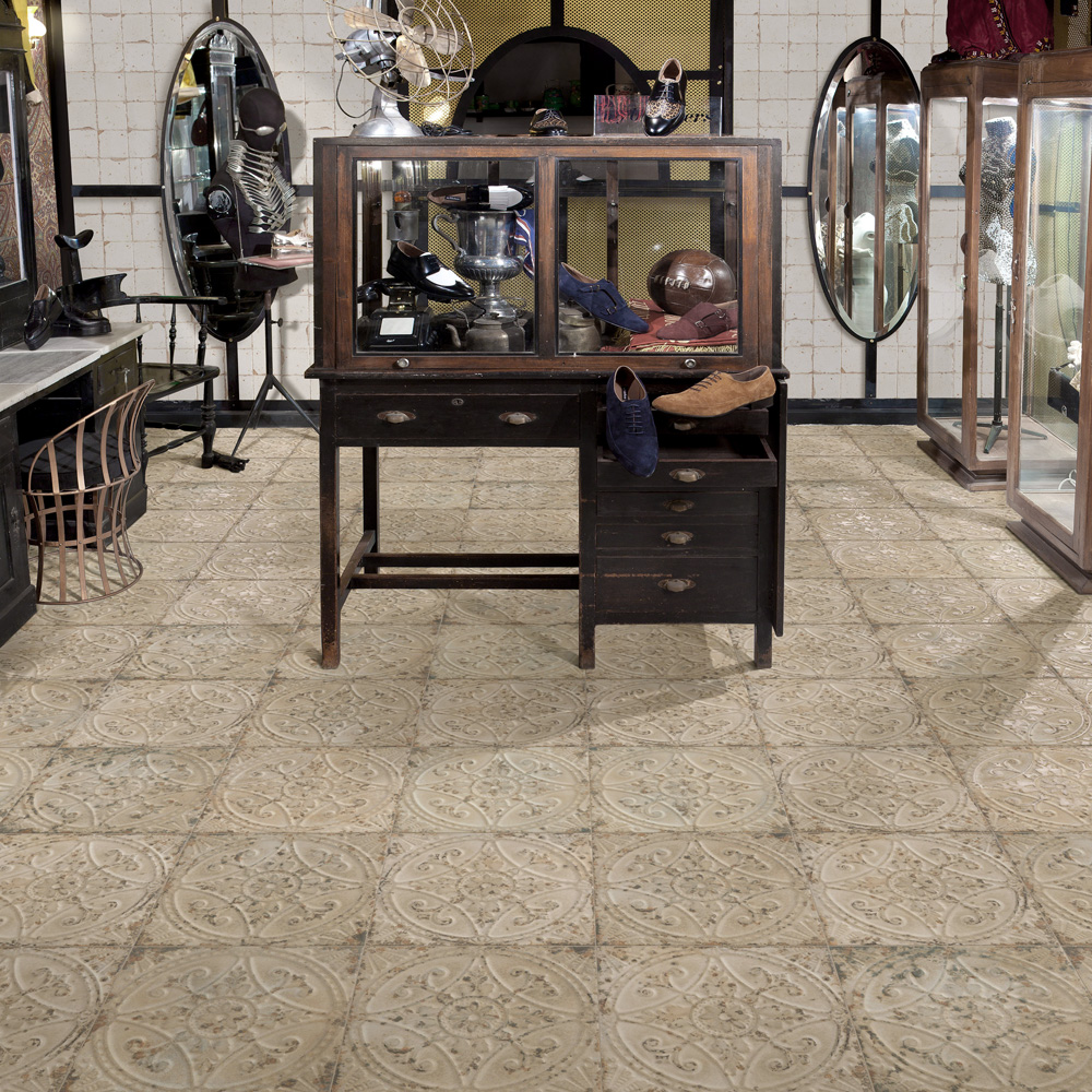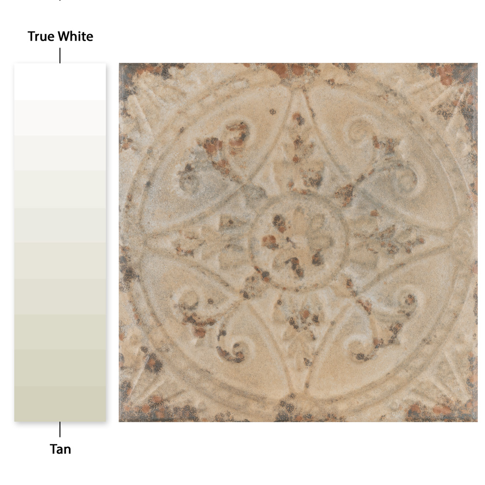 Ceramic Floor and Wall Tile is inspired directly by a series of rusted metallic molds that were originally used to shape ceiling plaster moldings. Named after the Saja River in Spain, this tile features raised floral motifs that are reminiscent of tin ceiling tiles in beige, brown and terracotta tones. Designed by interior architect and furniture designer Francisco Segarra, this tile is a true reflection of vintage industrial design. Realistic imitations of scuffs and spots that are the marks of well-loved, worn, century-old tile bring rustic charm to any interior setting. These rustic scuffs and spots convince that this tile is truly aged. Available in 10 print variations that are randomly scattered throughout each case, the variation throughout each tile mimics an authentic aged appearance. Its glazed and durable features makes it an ideal choice for indoor installations including kitchens, bathrooms, showers, backsplashes, and fireplace facades. Tile is the better choice for your space. This tile is made from natural ingredients, making it a healthy choice as it is free from allergens, VOCs, formaldehyde and PVC.