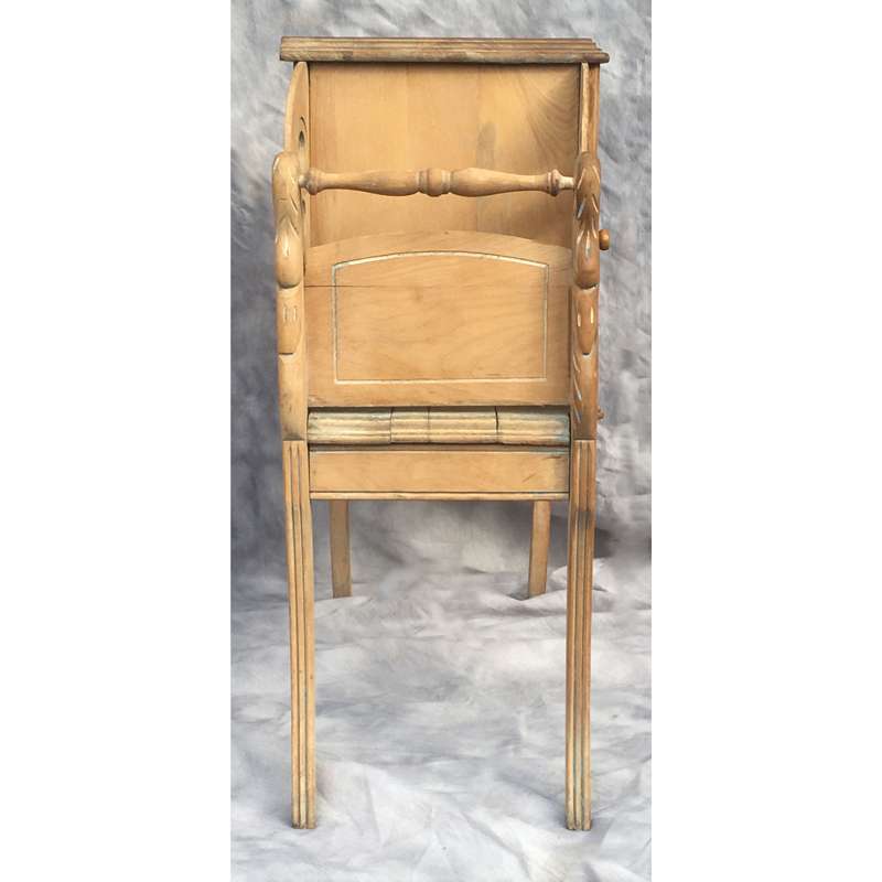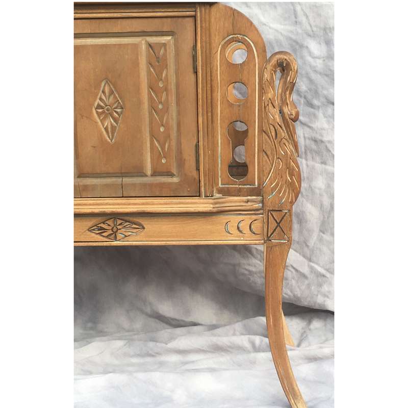 A stunning vintage circa 1920's humidor table and magazine rack, flanked by carved Swans. This intricately carved table stand 26" tall and 23" wide. The center opening is lined with copper and is almost a perfect 10" x 10" cube, for full dimensions please see the dimensions tab. It has been, mostly, stripped of paint there are a few cracks in the wood as shown in the photos but the piece is solid and has been recently repaired. The intricate ornate details of the table humidor are sure to create a decadent statement in any home.